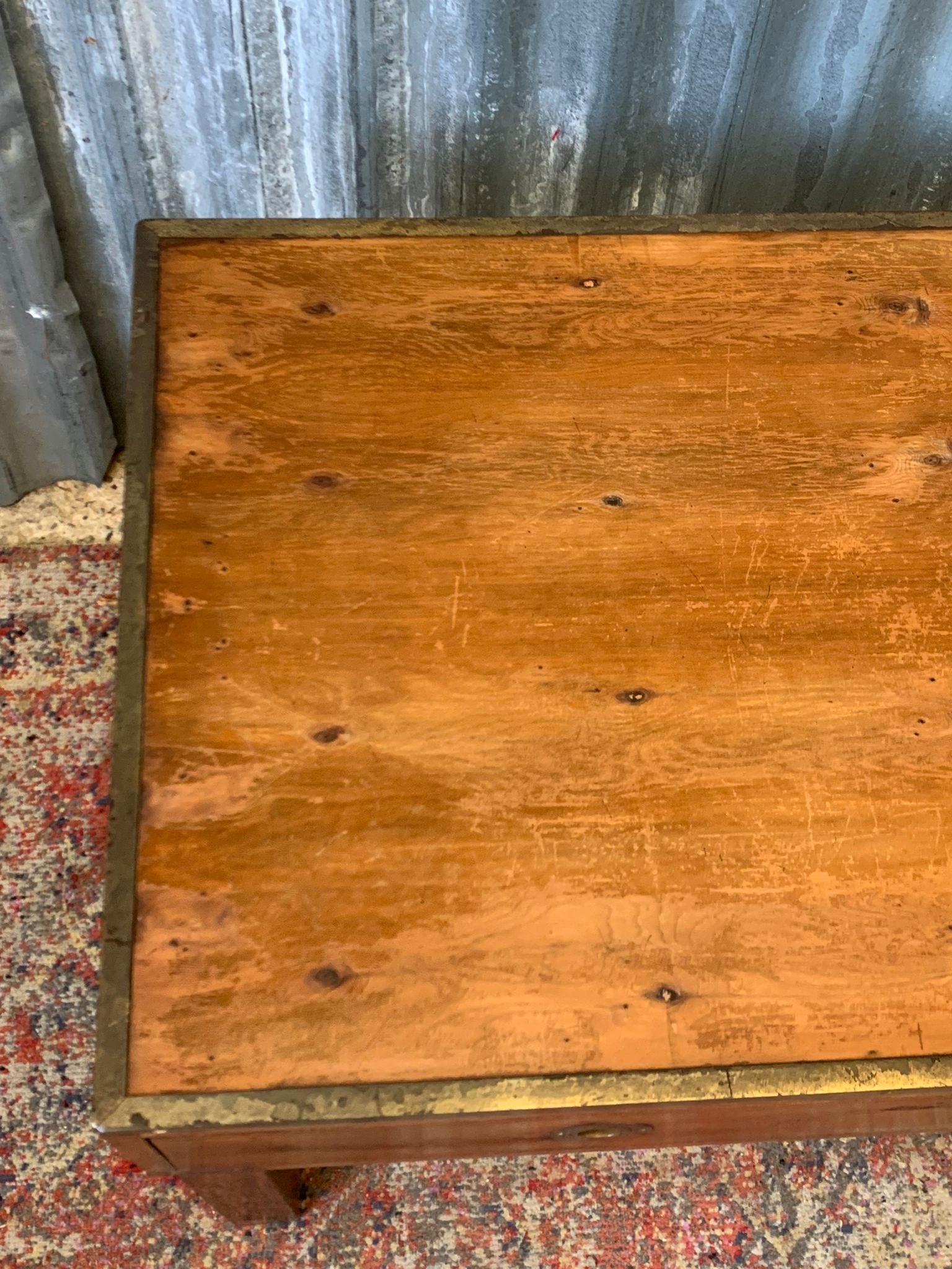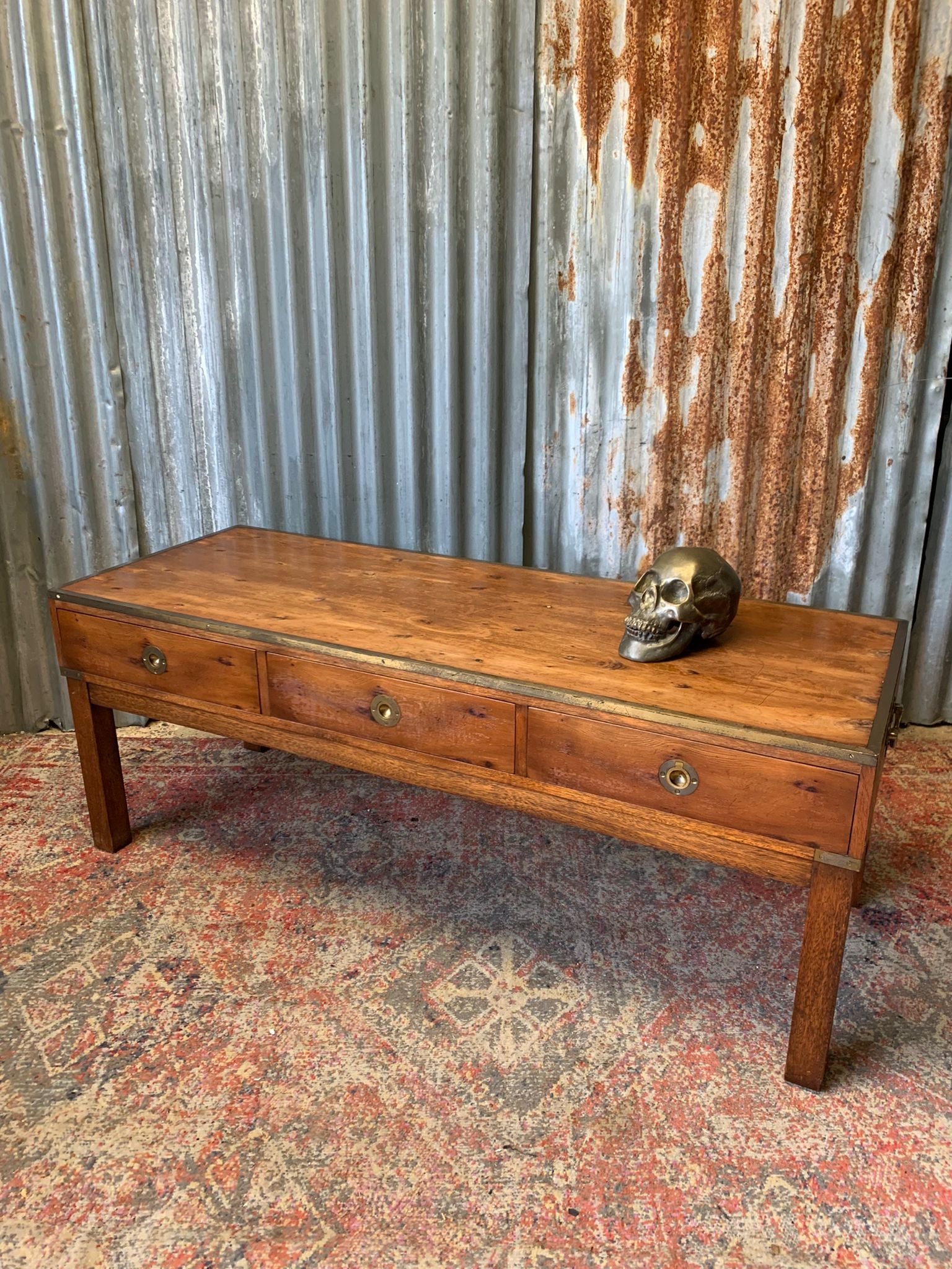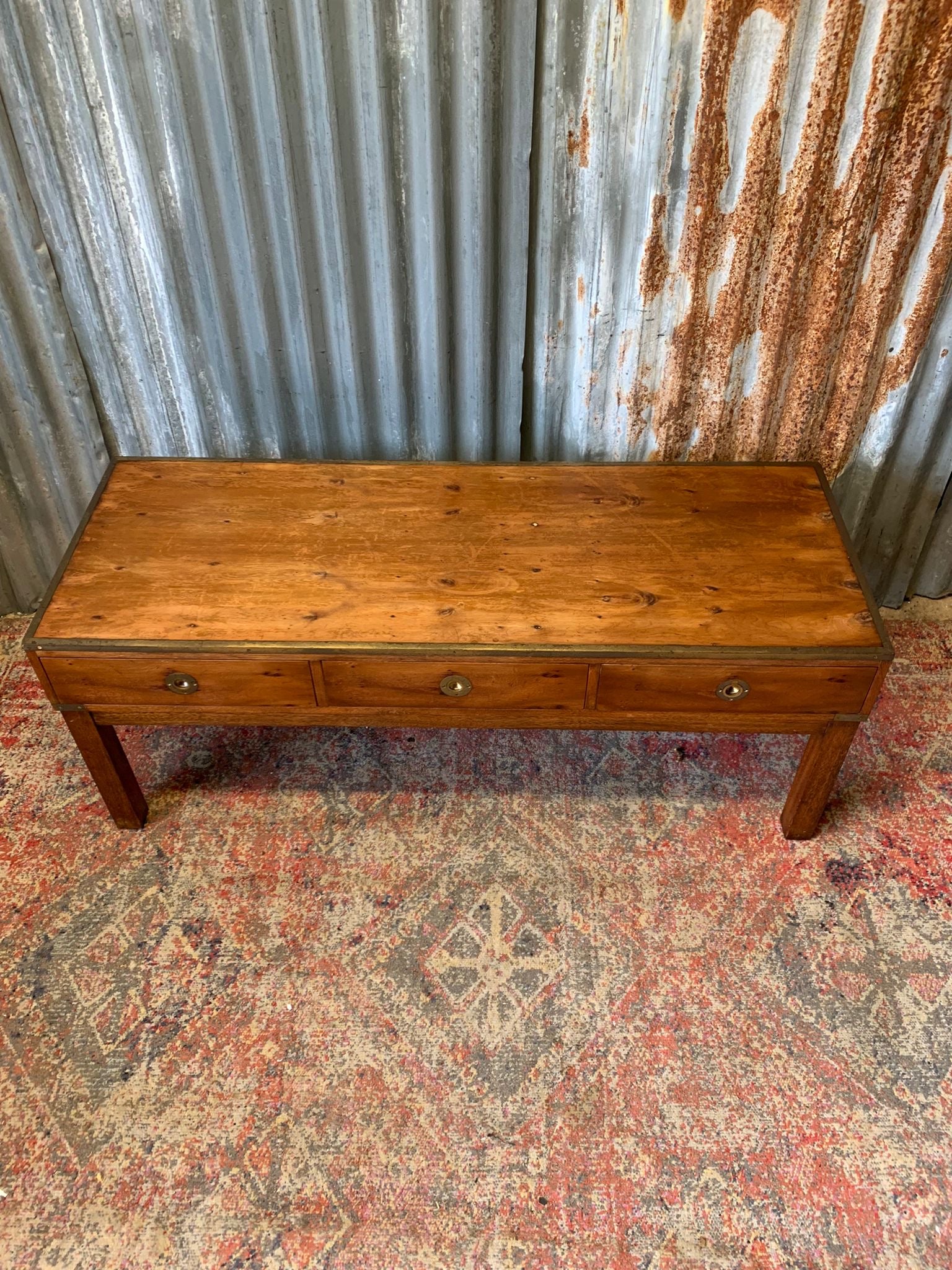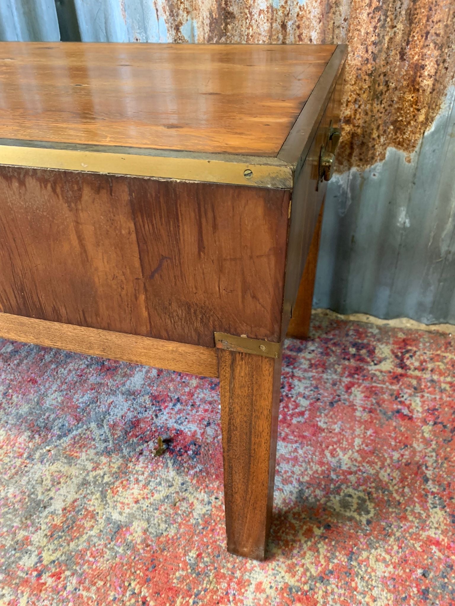 Made in the campaign style with brass edging and recessed handles on each of the three drawers. Brass carrying handles at either end.
