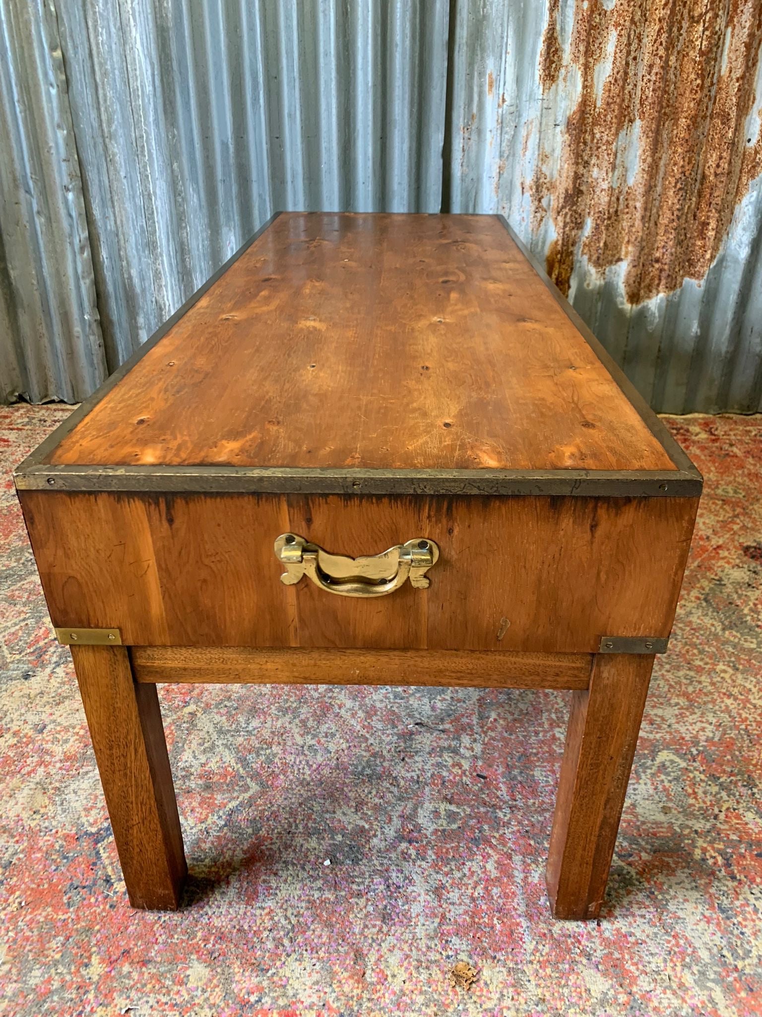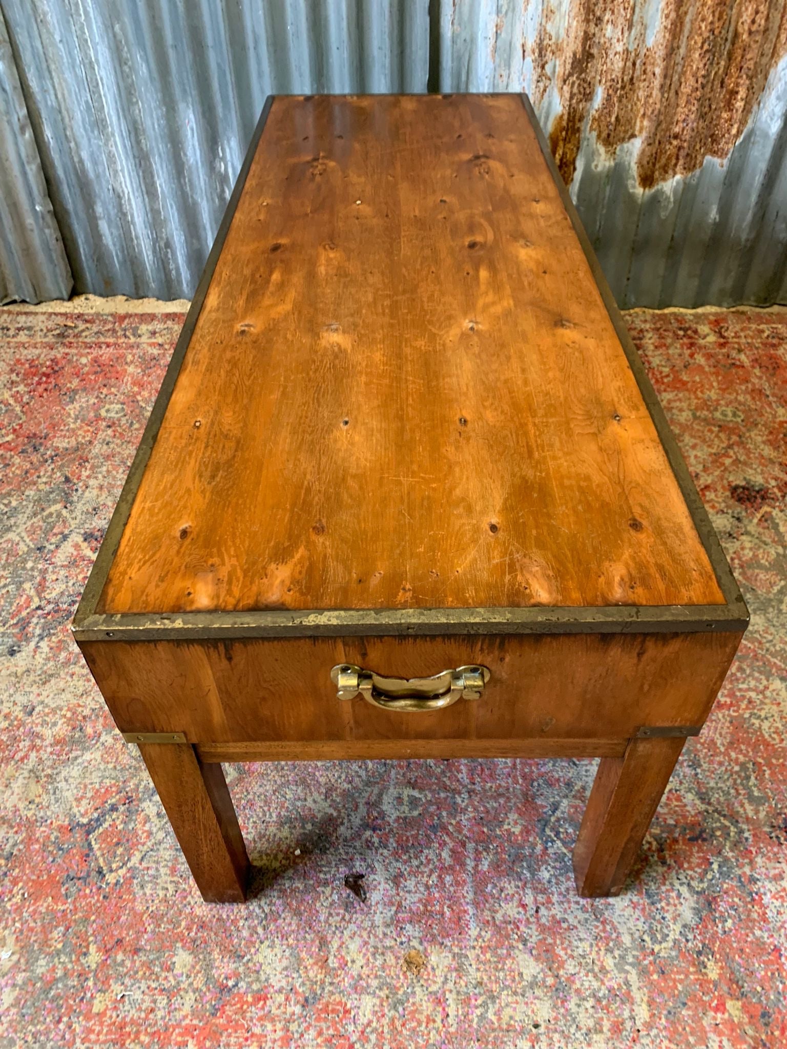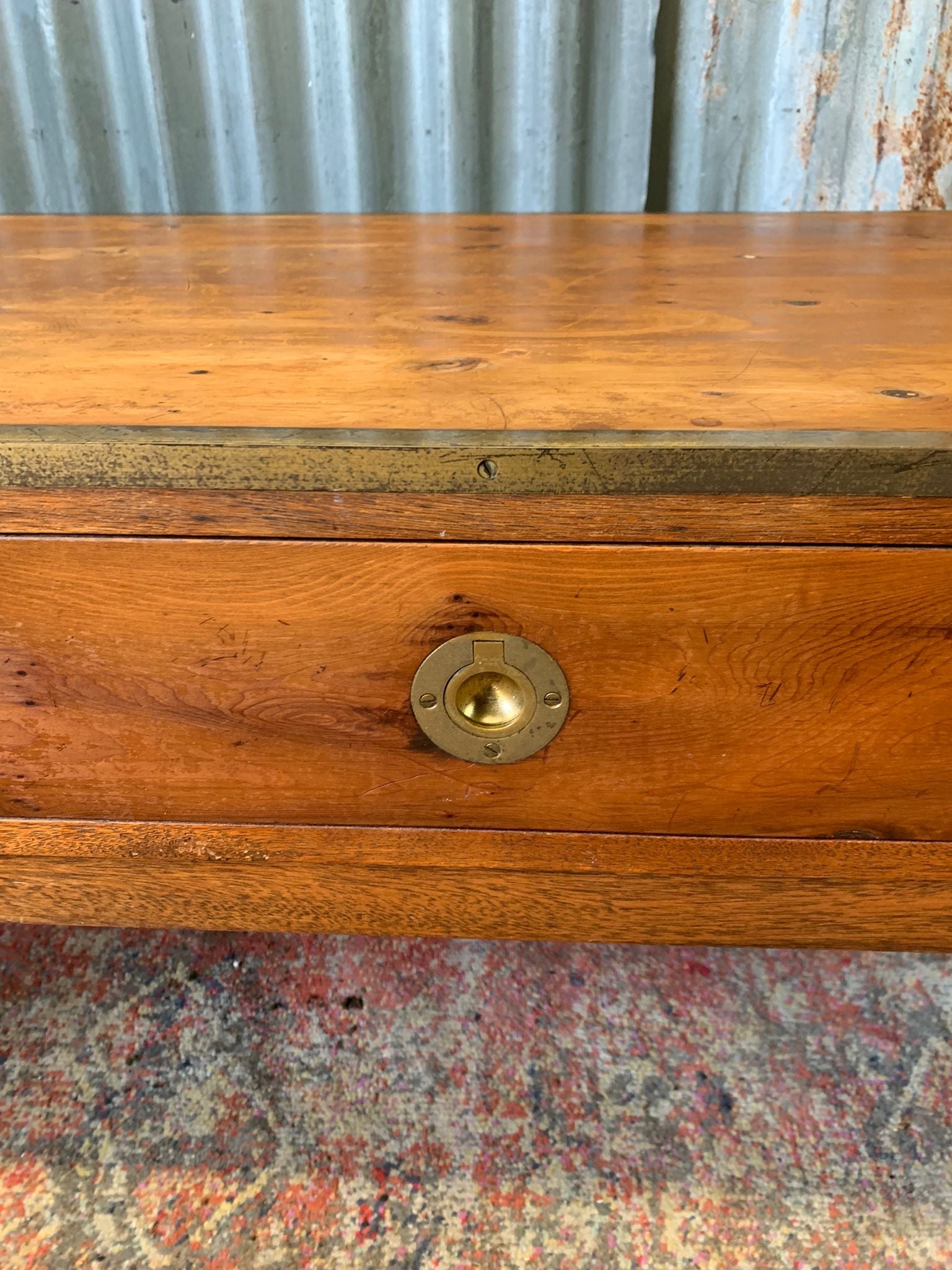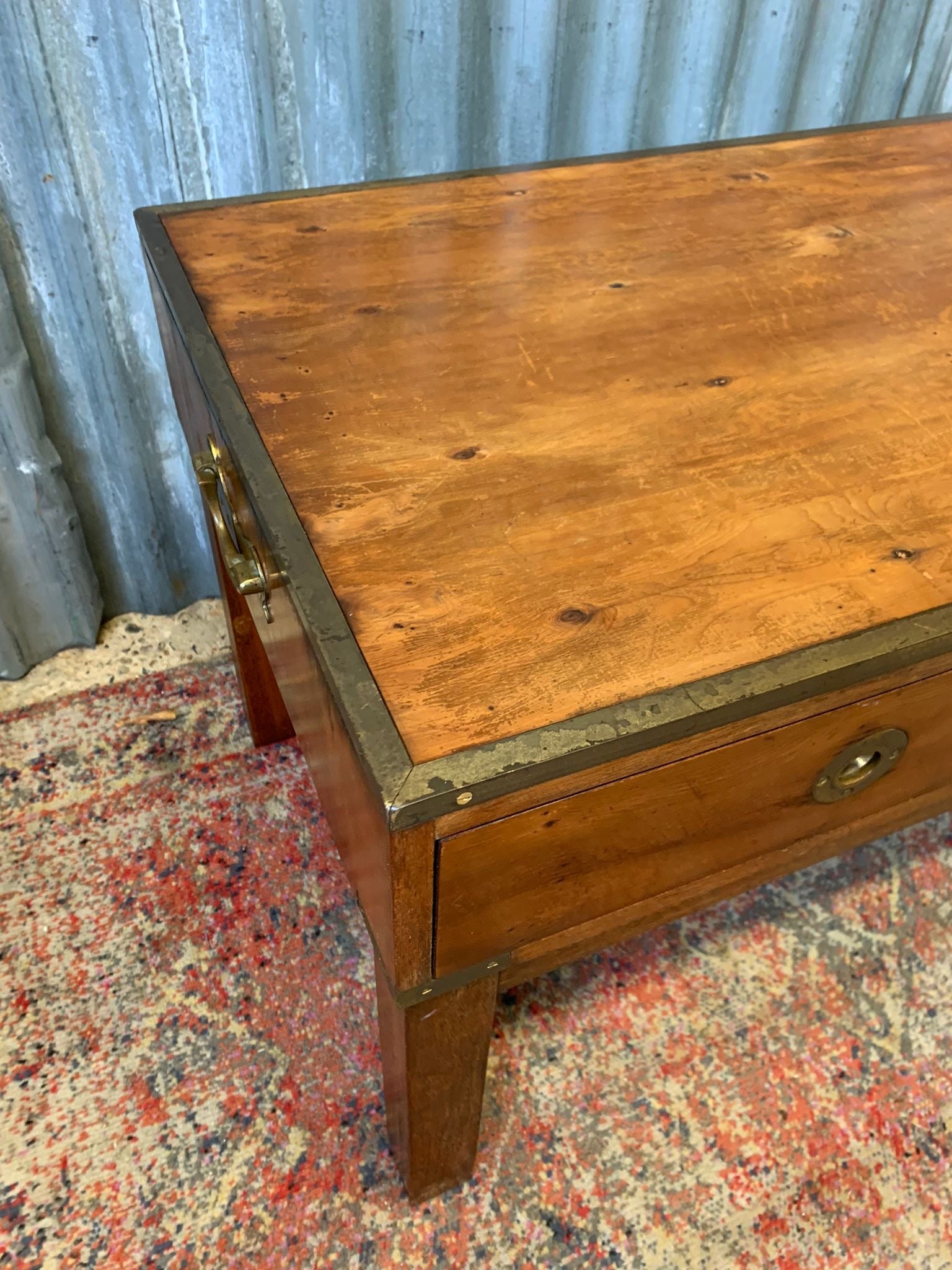 Made in the campaign style with brass edging and recessed handles on each of the three drawers. Brass carrying handles at either end.