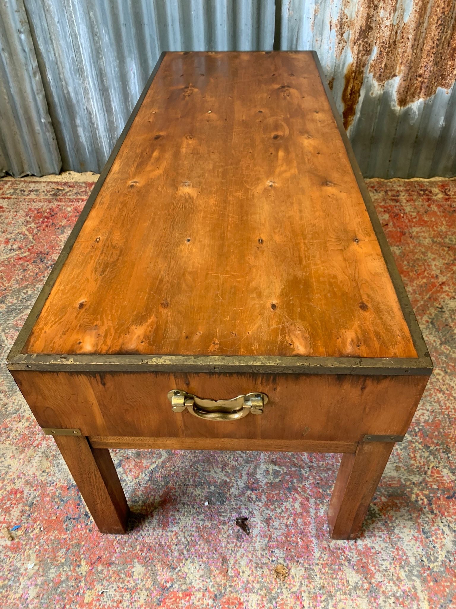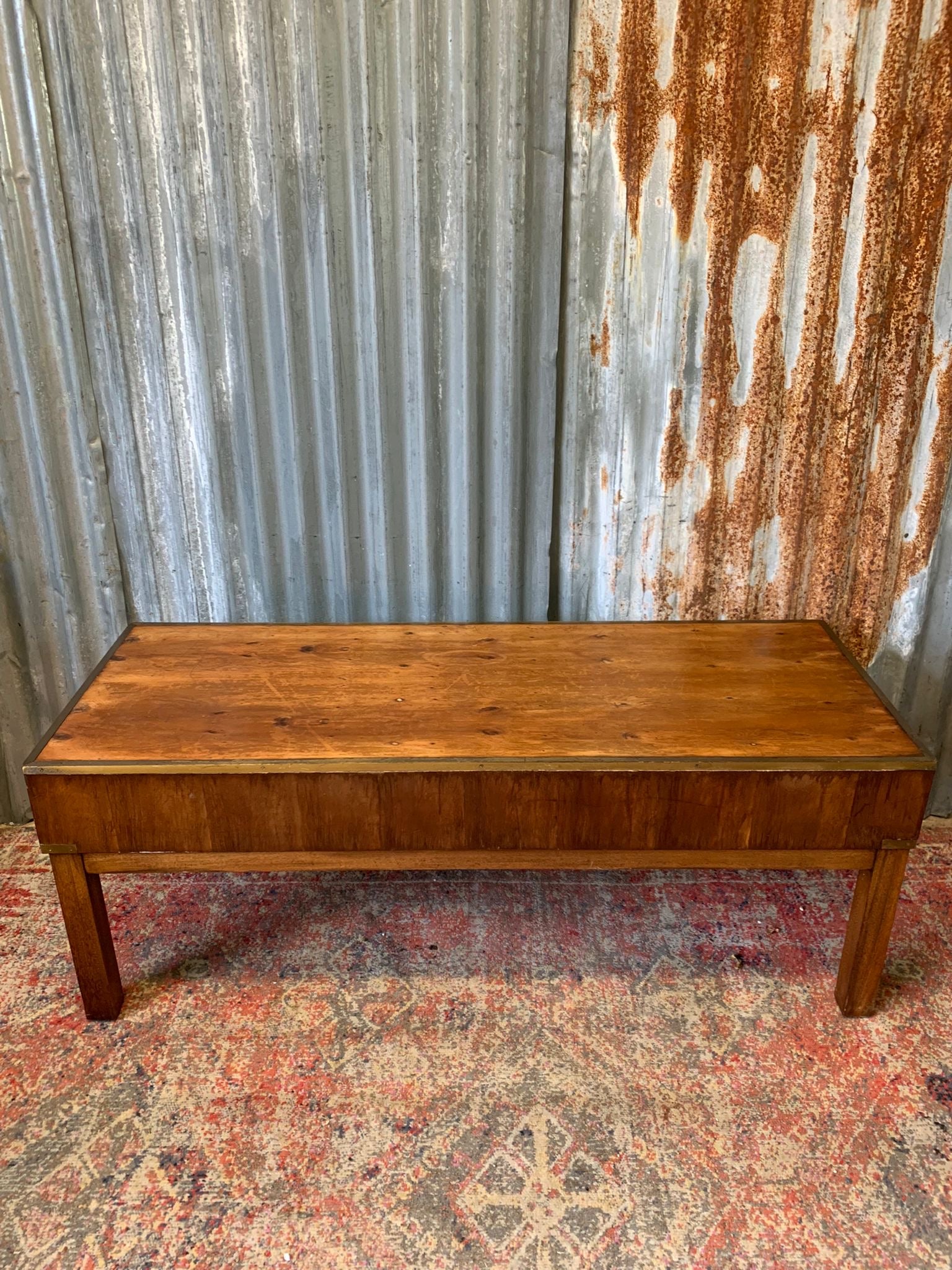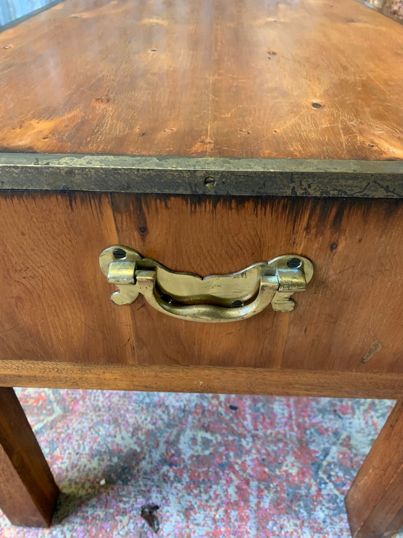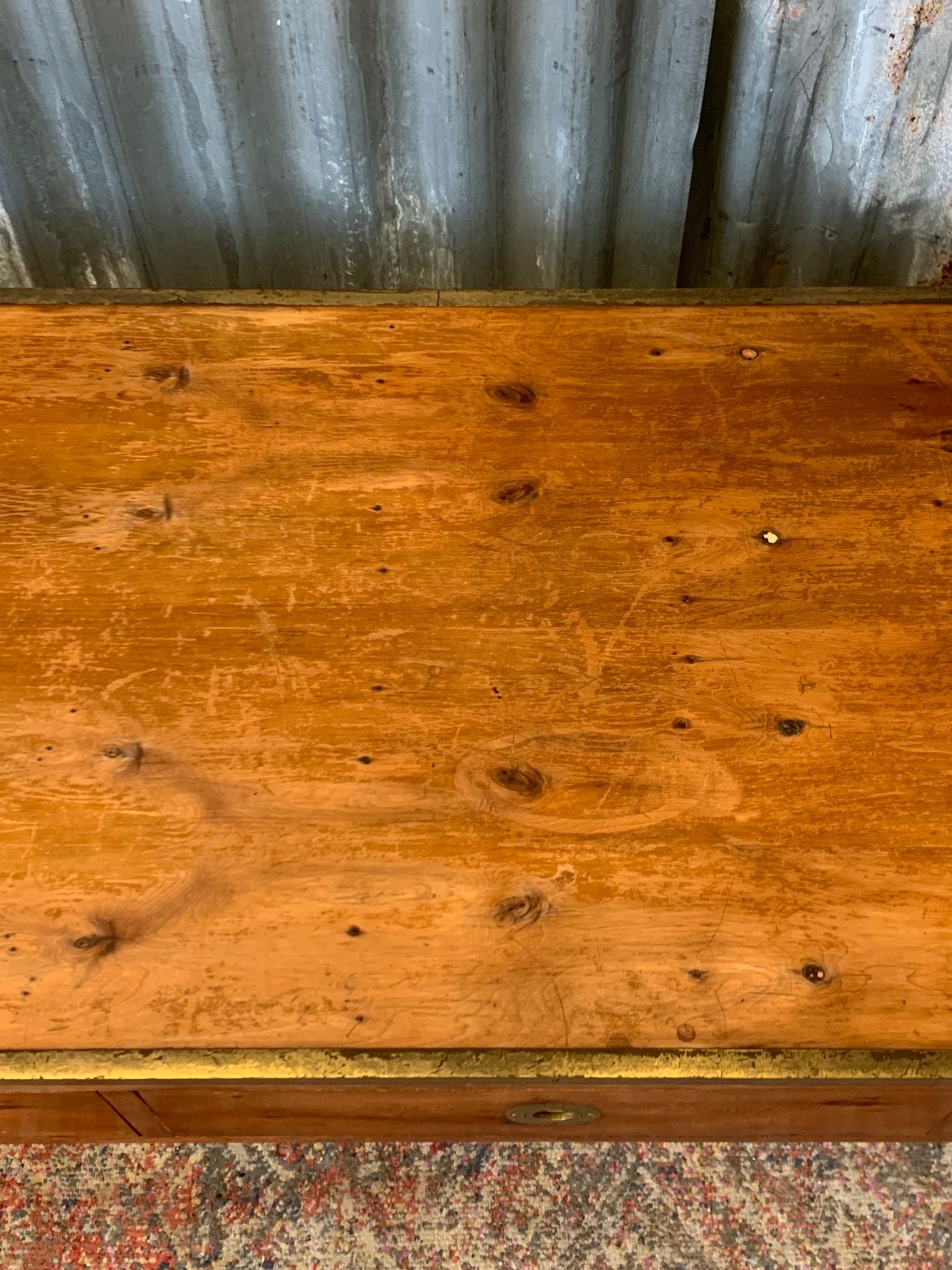 Made in the campaign style with brass edging and recessed handles on each of the three drawers. Brass carrying handles at either end.