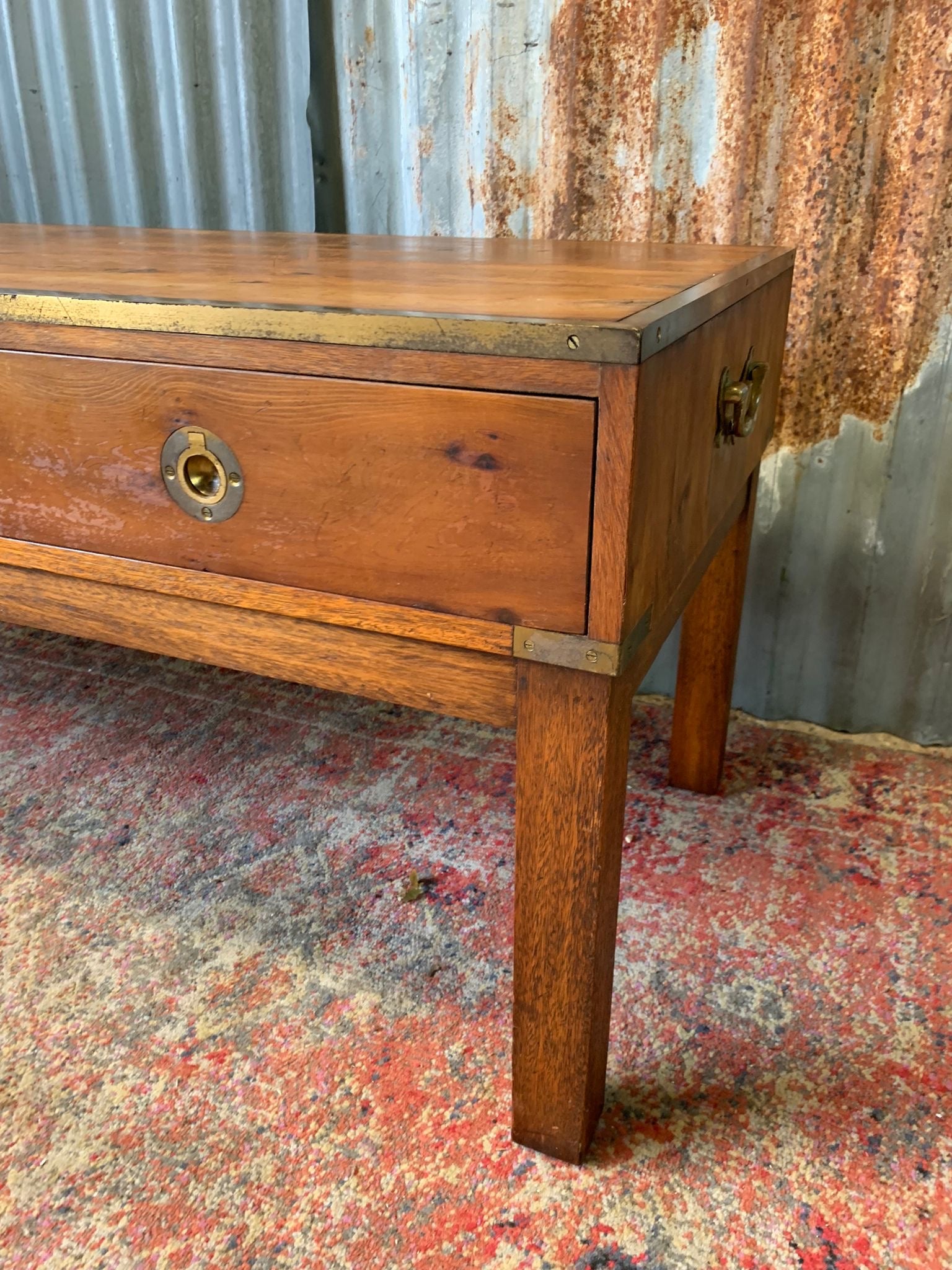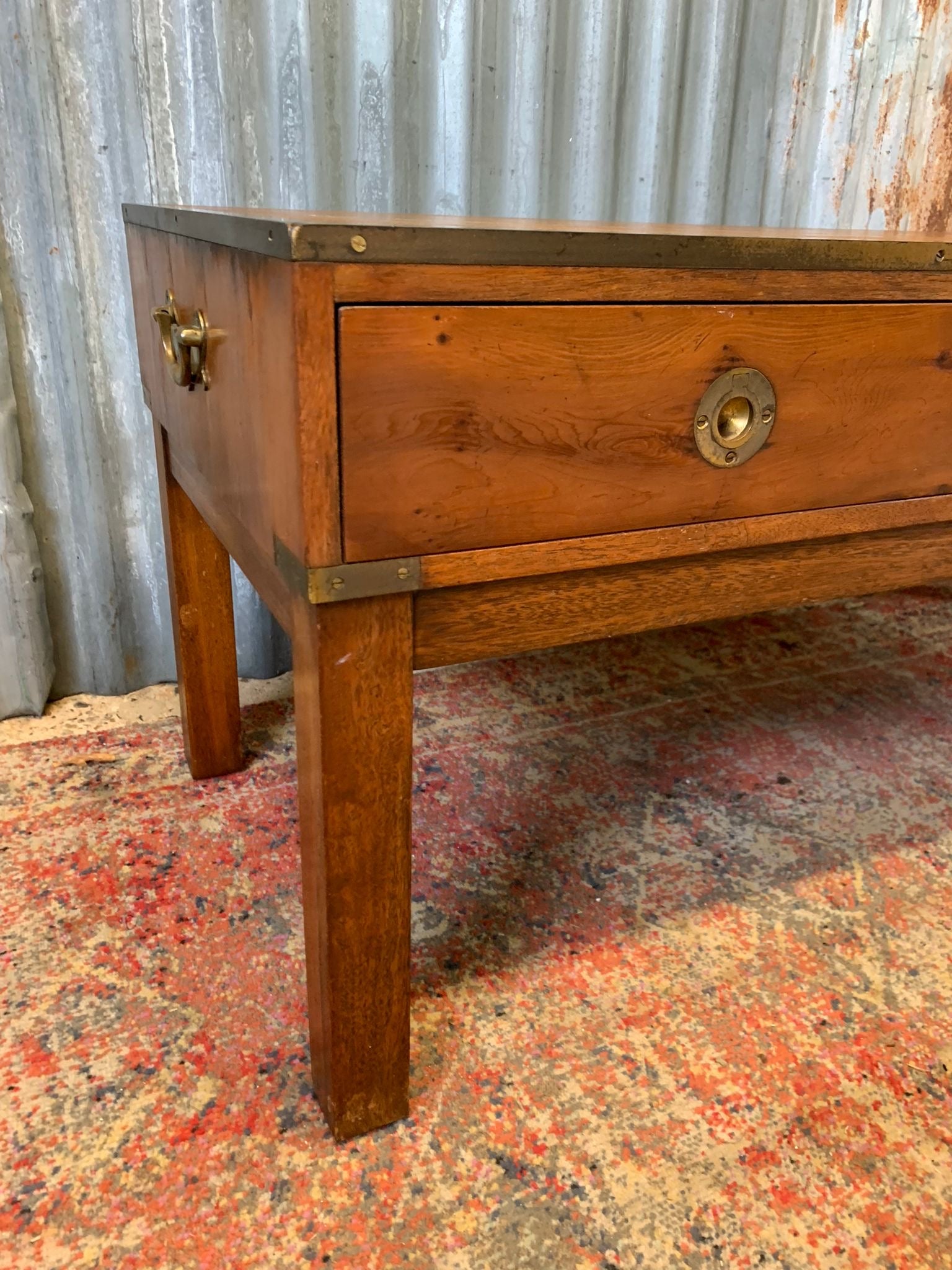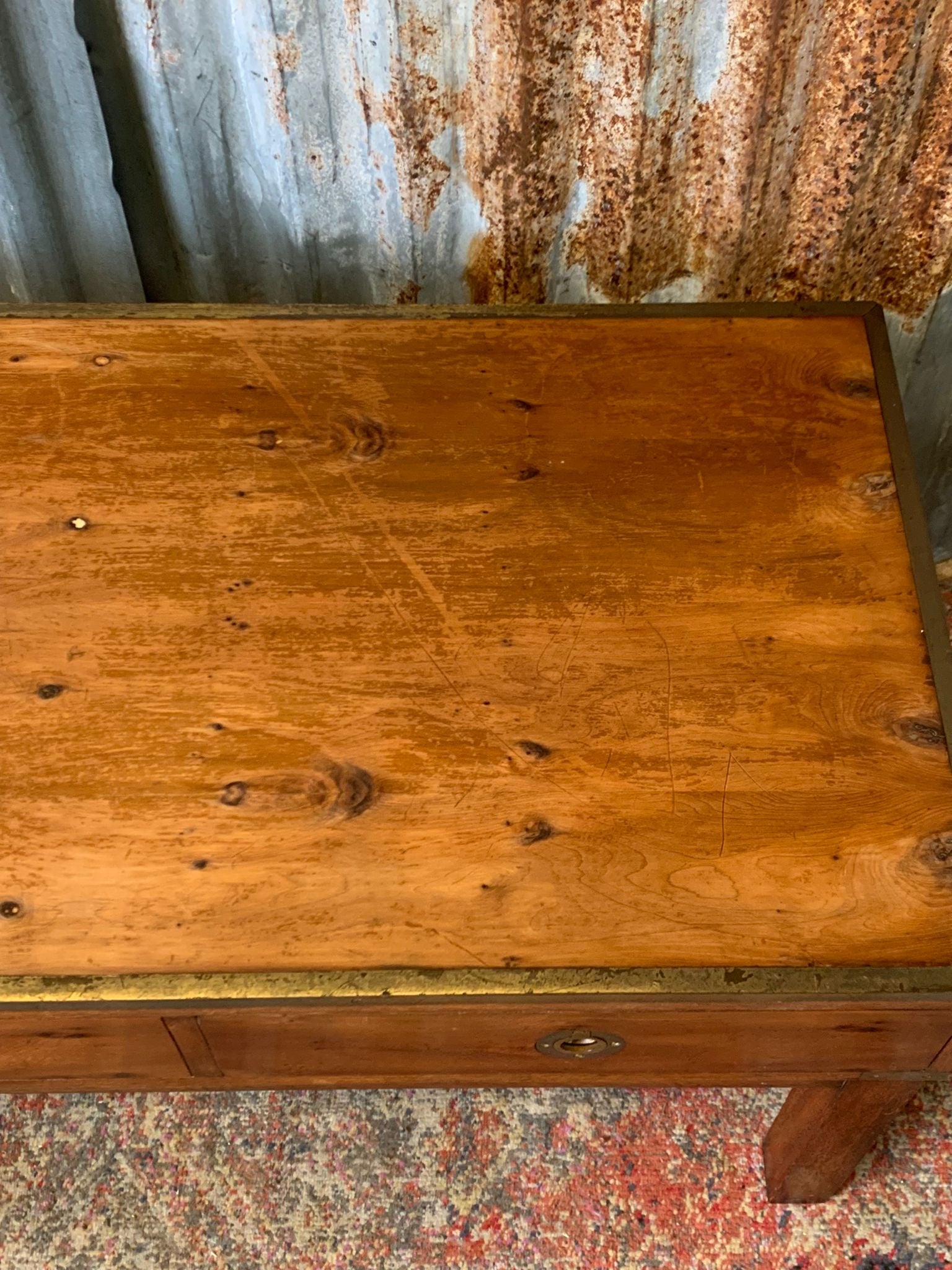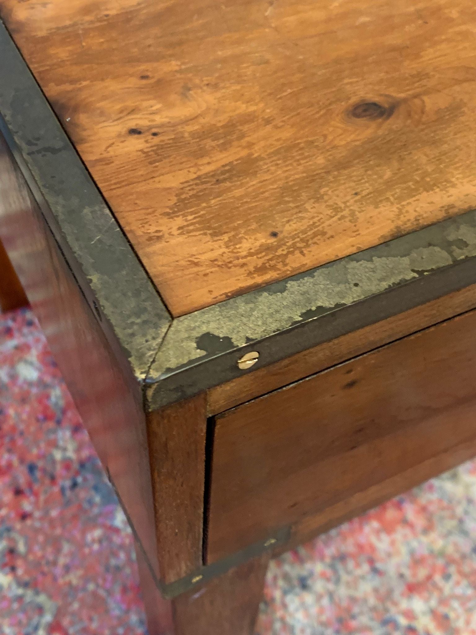 Made in the campaign style with brass edging and recessed handles on each of the three drawers. Brass carrying handles at either end.