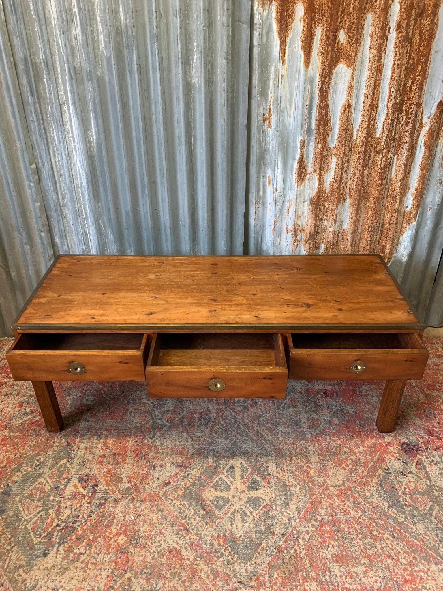 A handsome, large and low wooden console table with three drawers. Also perfect as a media unit or coffee table.