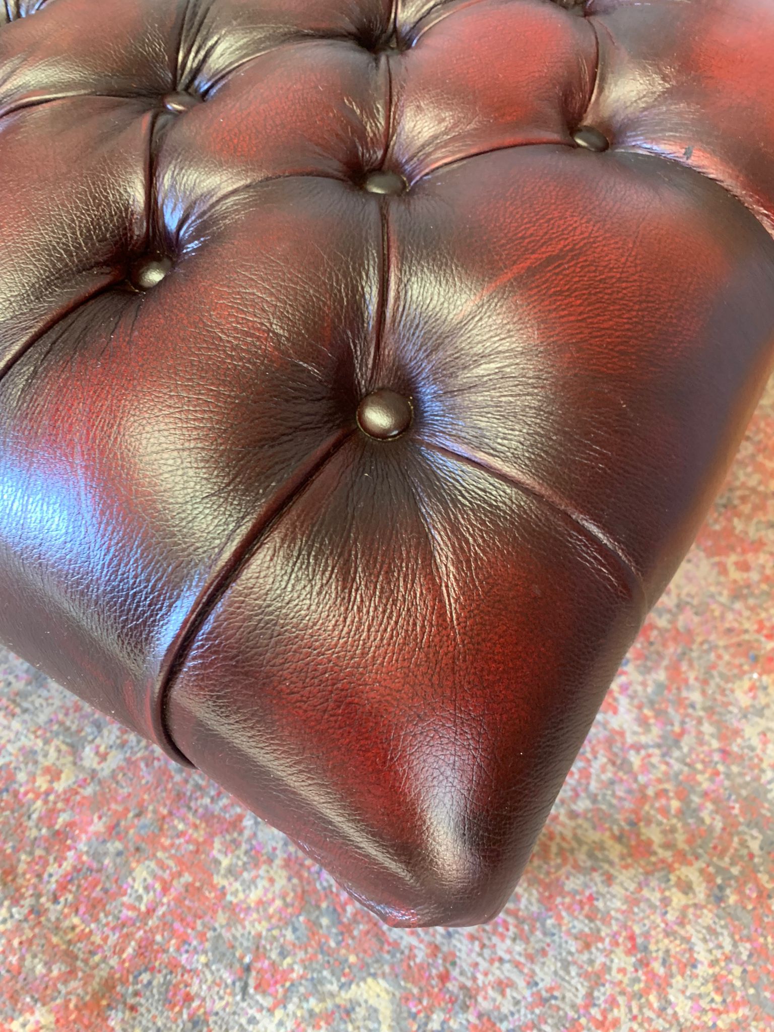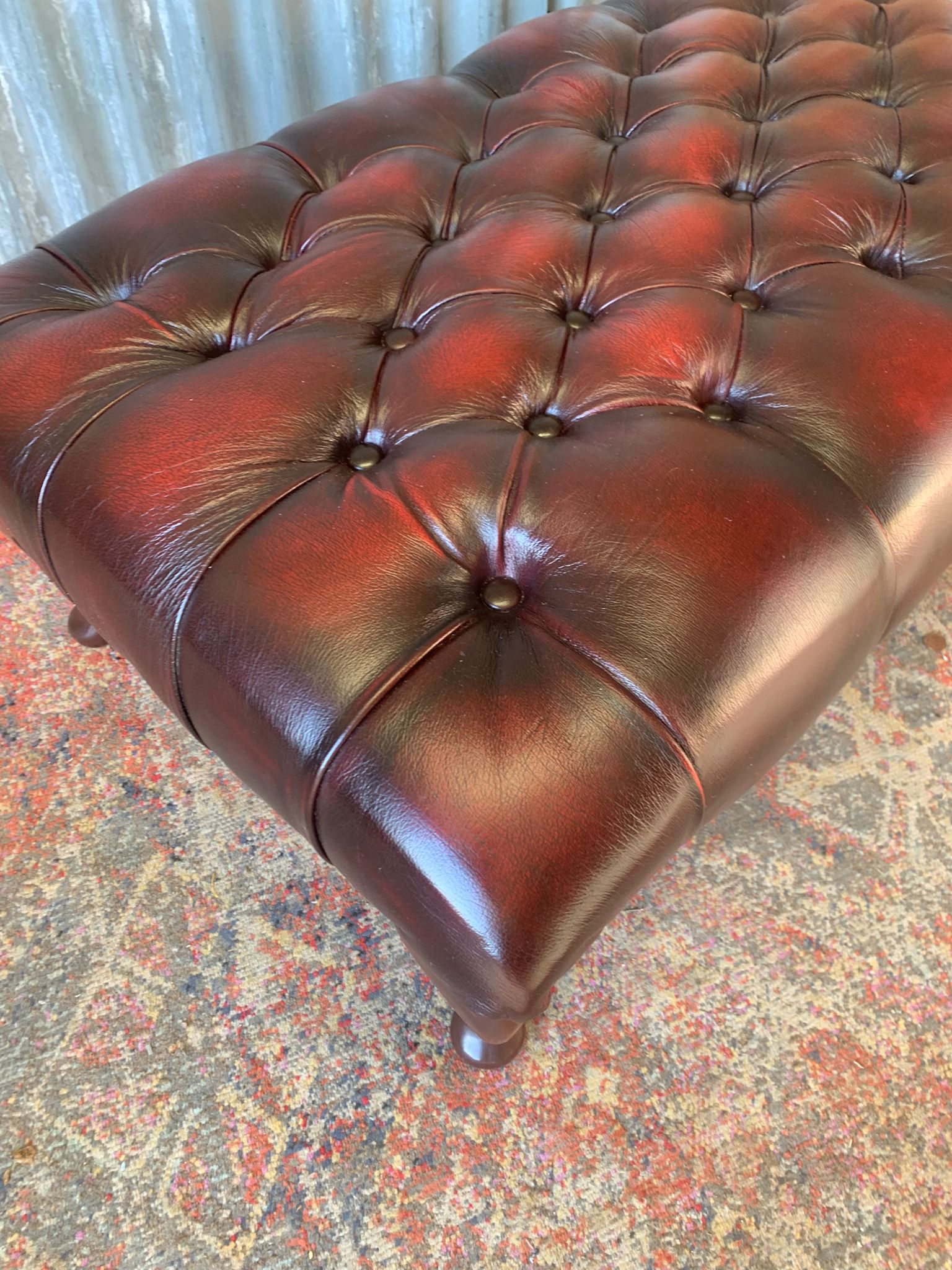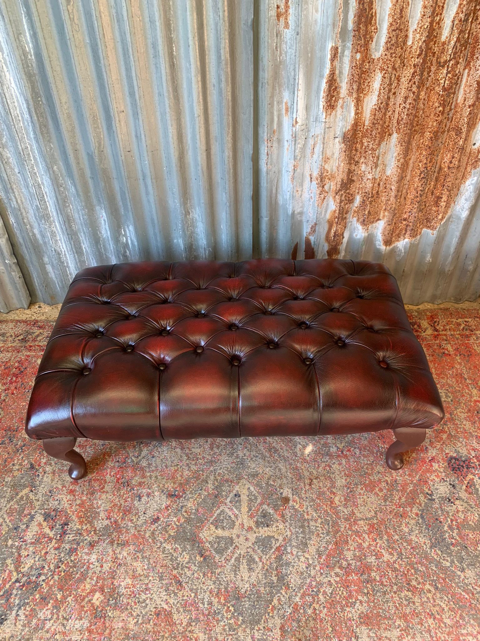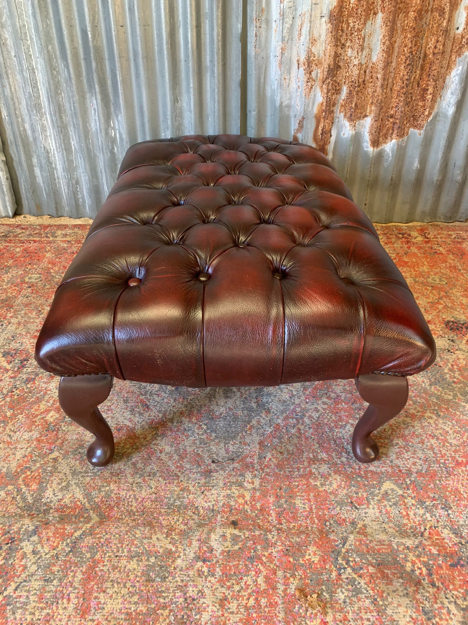 A beautiful, large red leather footstool. Fully buttoned with lovely cabriole legs. A whopper at 98cm wide!