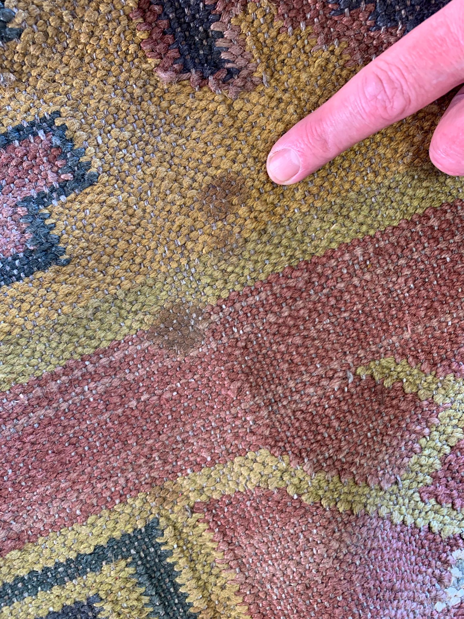 Please note: NO RETURNS. This rug has wear as with all old rugs. It may have some or all of the following (as photographed): frayed edges, marks, fading, uneven edges, general wear/threadbare areas or holes, be dusty etc. It will not be perfect but it will be as seen. Please do use the zoom function. We do not accept returns so please be sure before you buy. Questions welcomed and more images available on request.