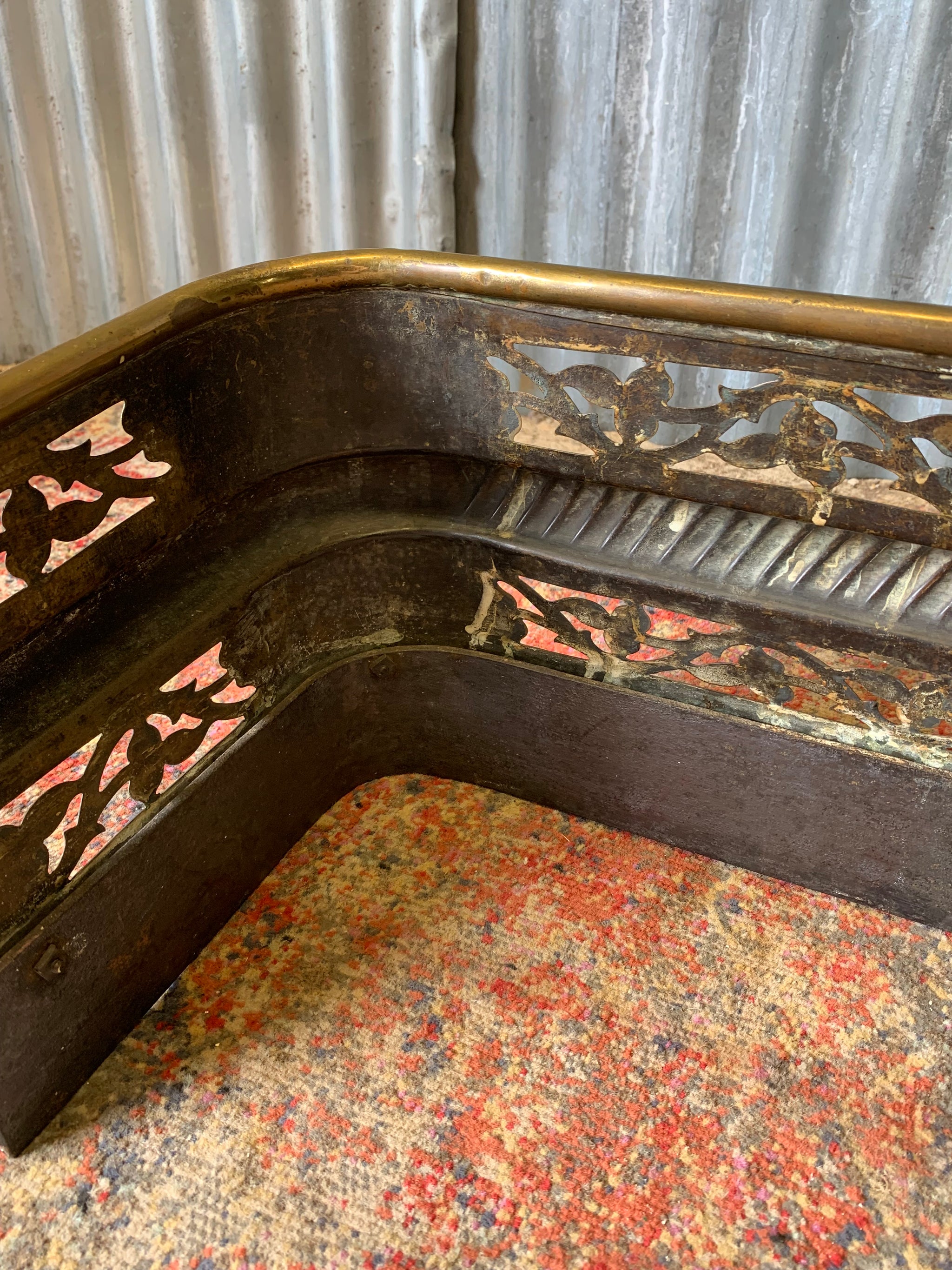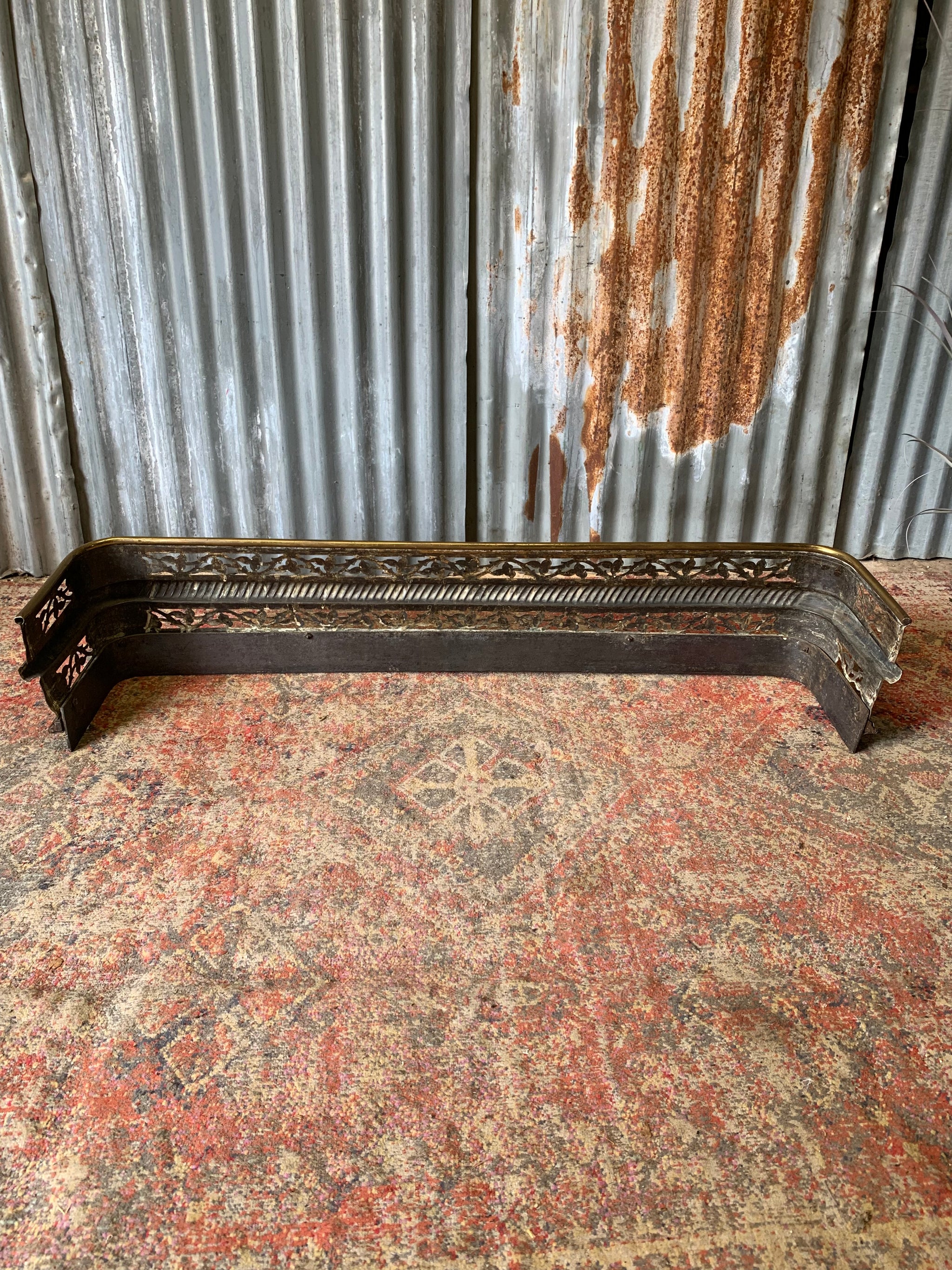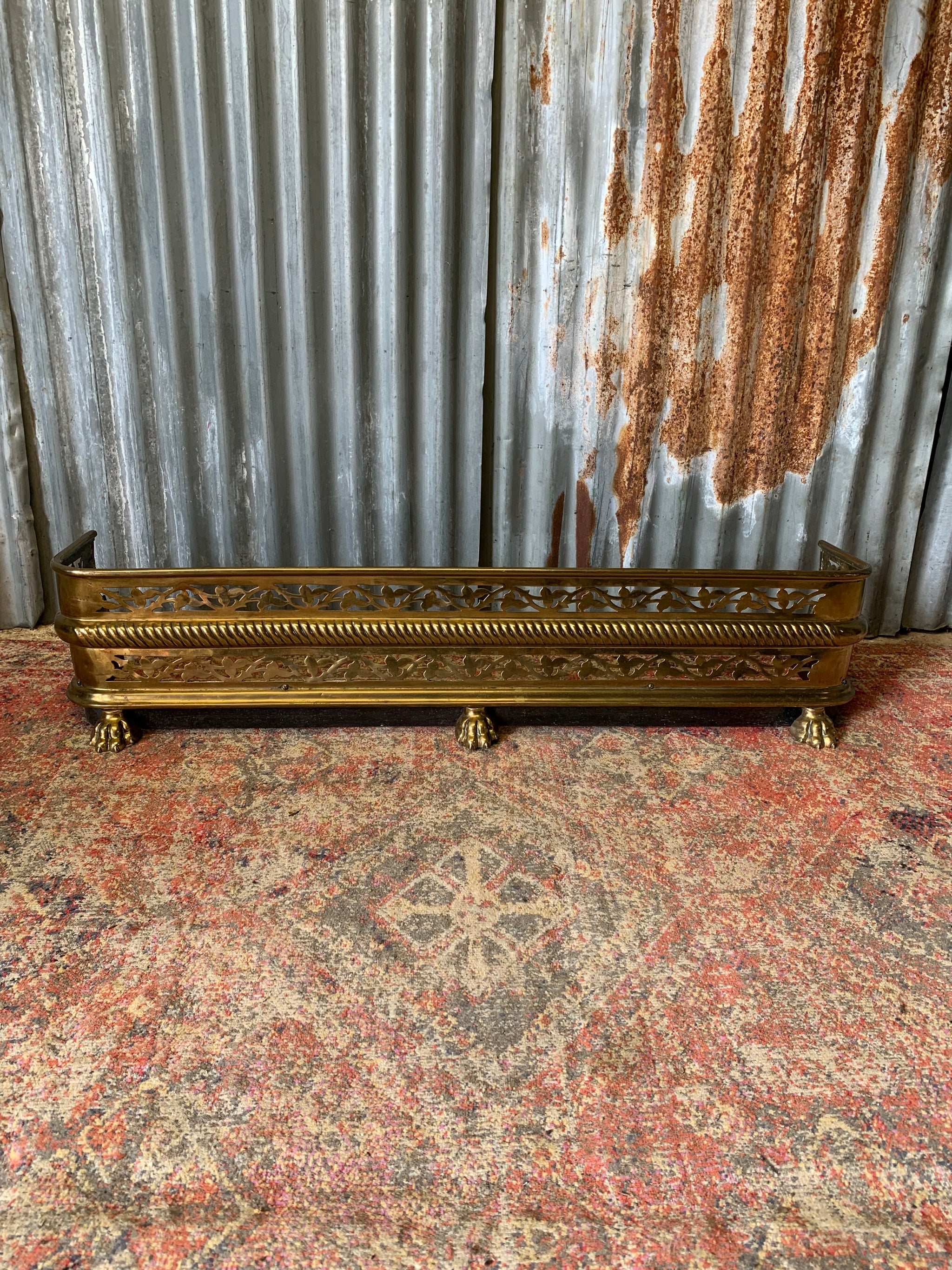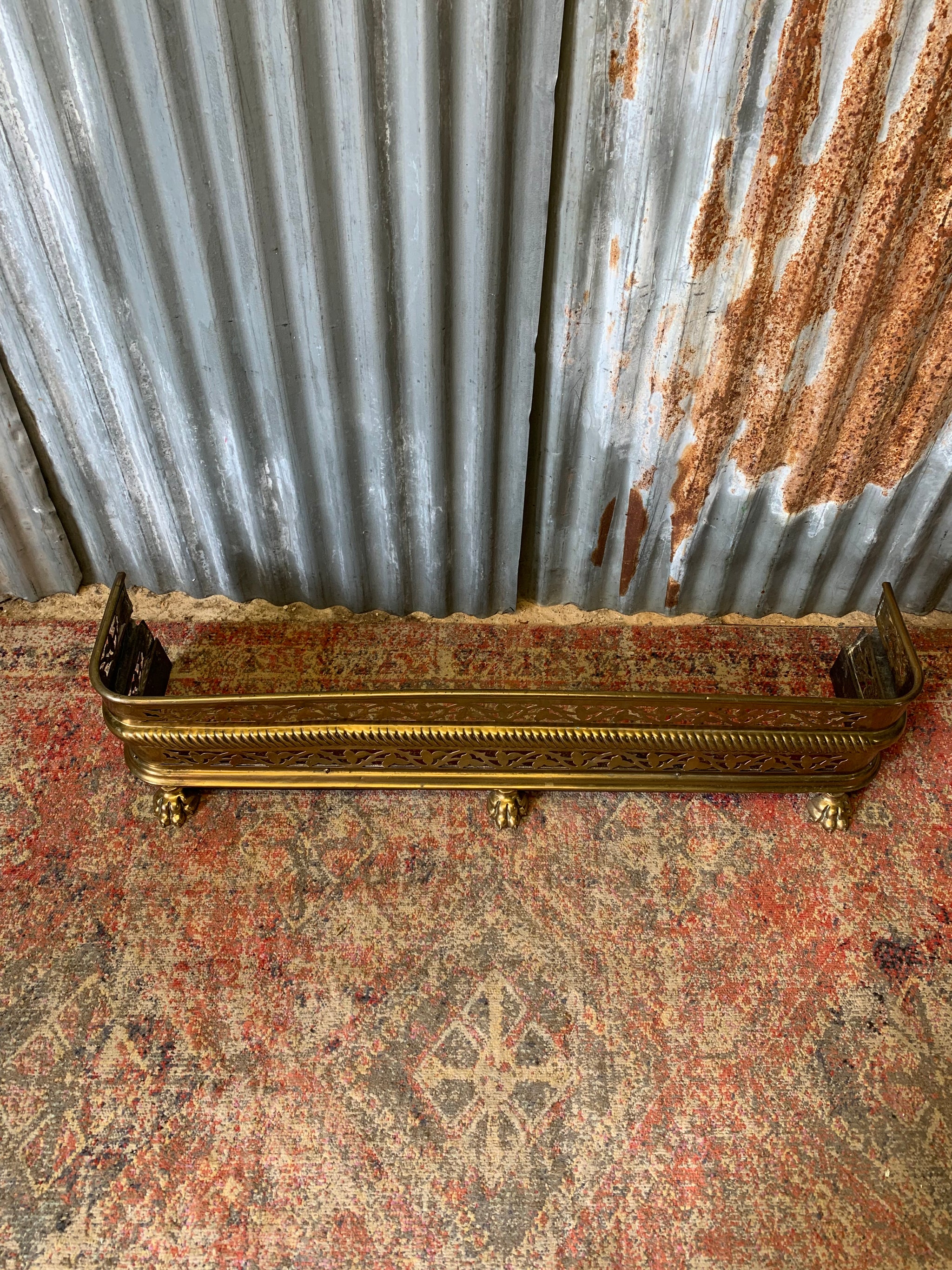 A wonderful Victorian brass fender with beautiful cutout design throughout and the most delightful brass lion paw feet.