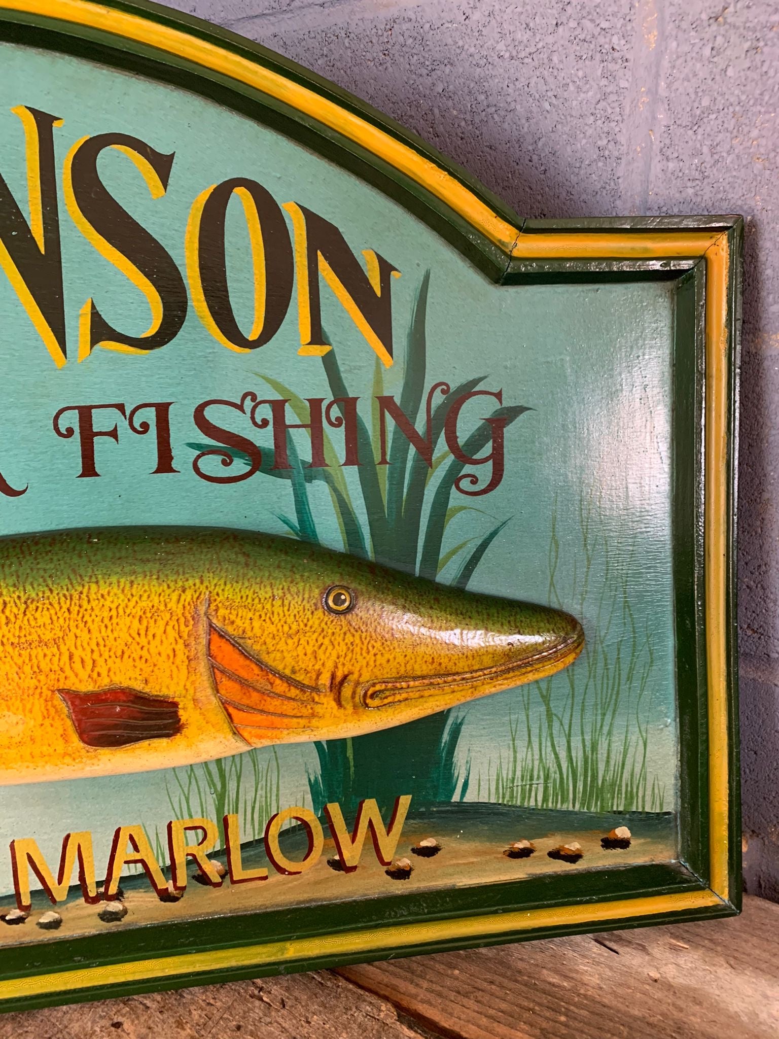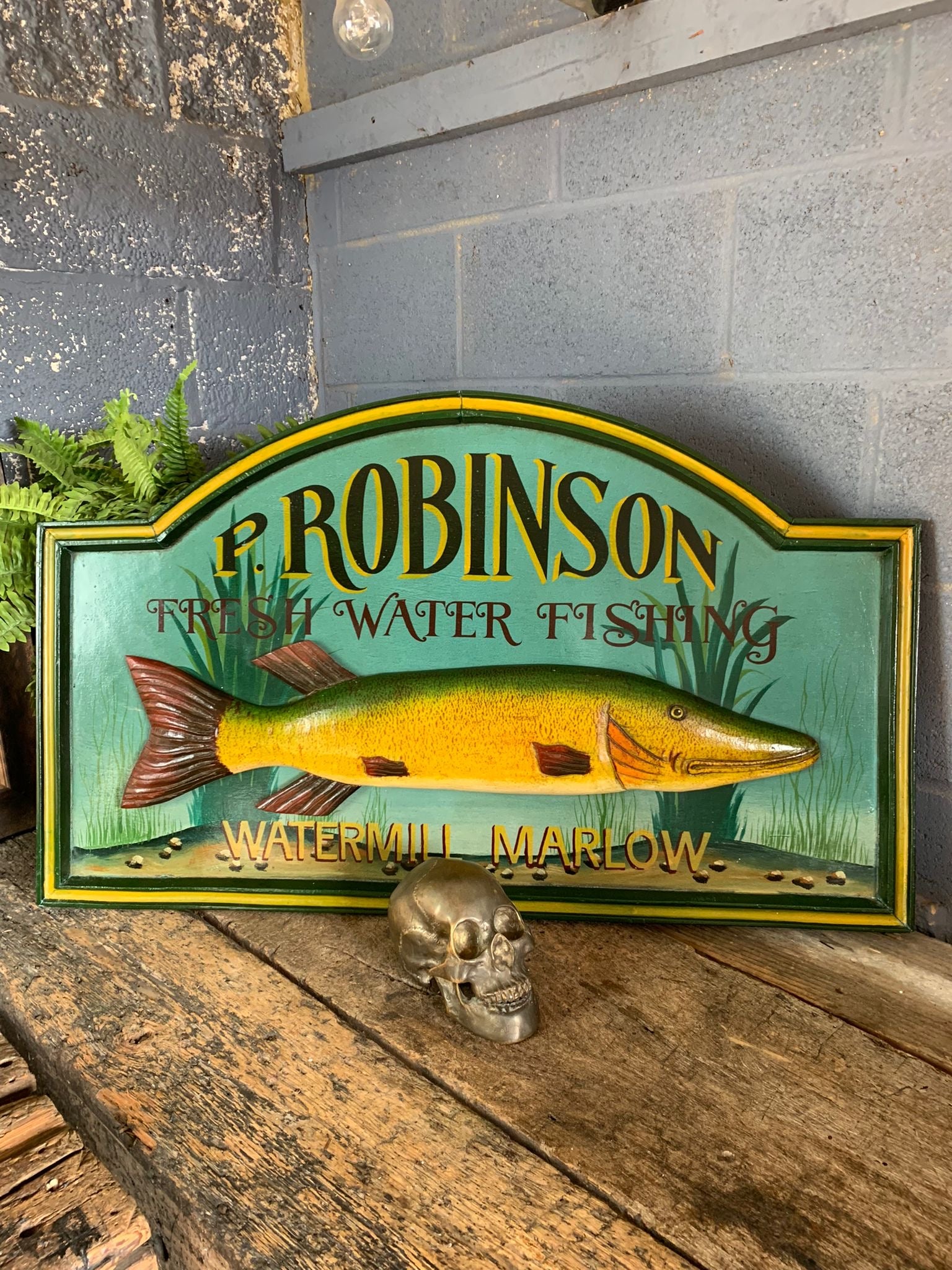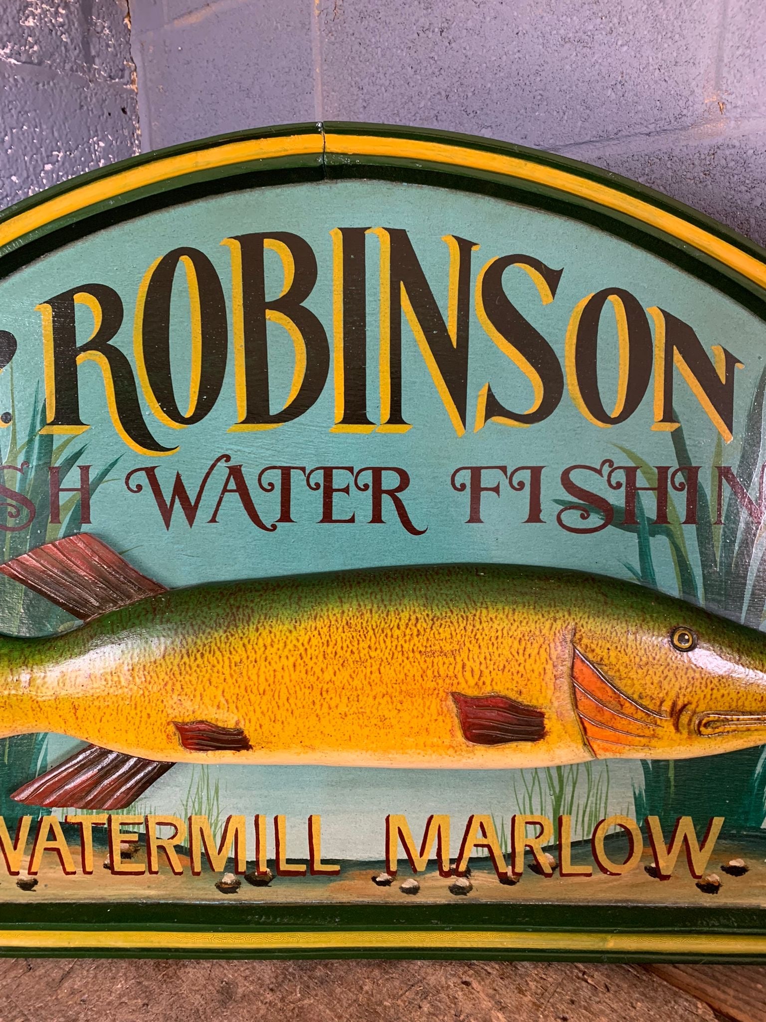 It reads “P. Robinson. Fresh Water Fishing. Watermill Marlow” and features a large trout or pike in relief, giving the piece a wonderfully decorative look.