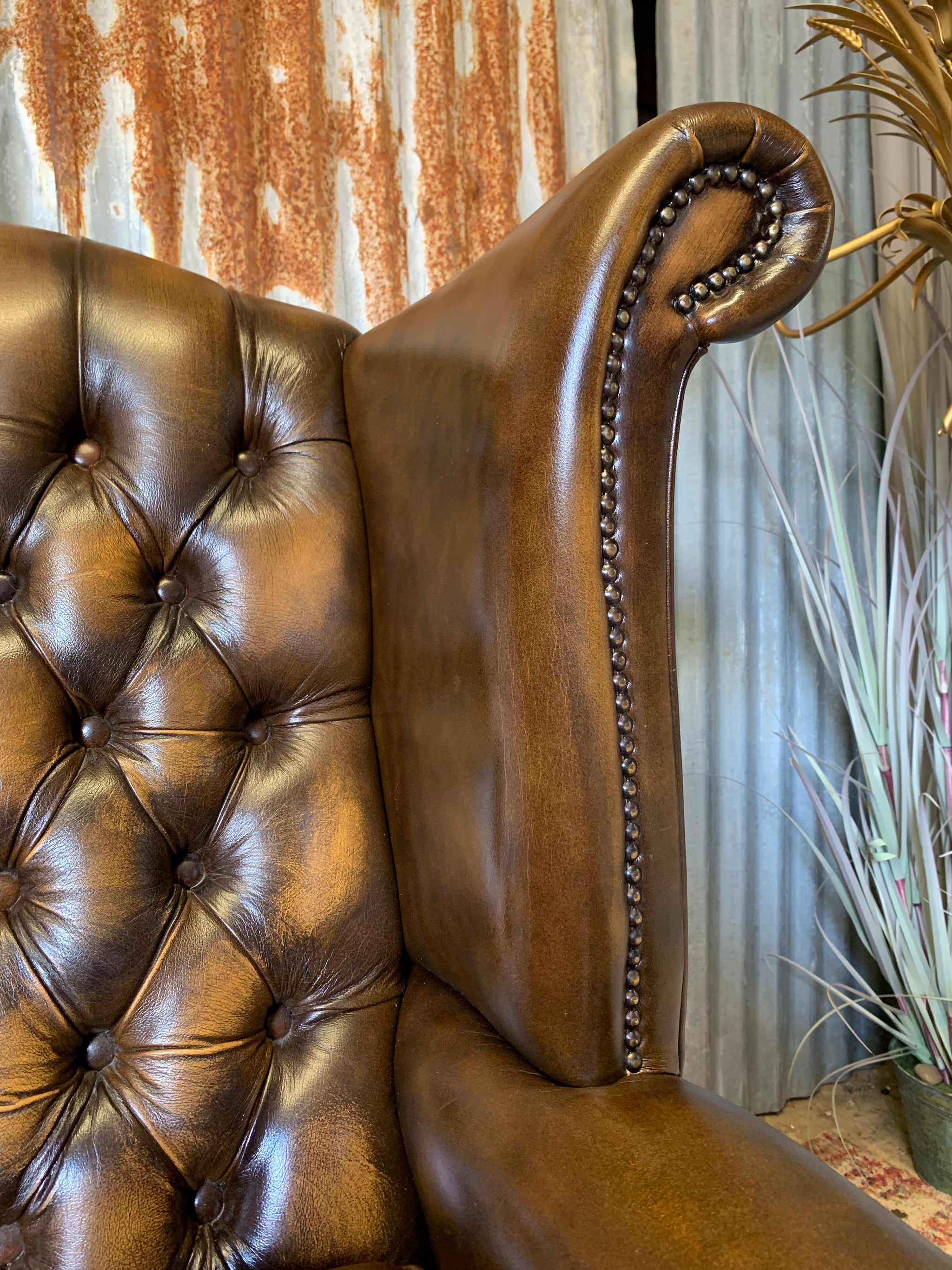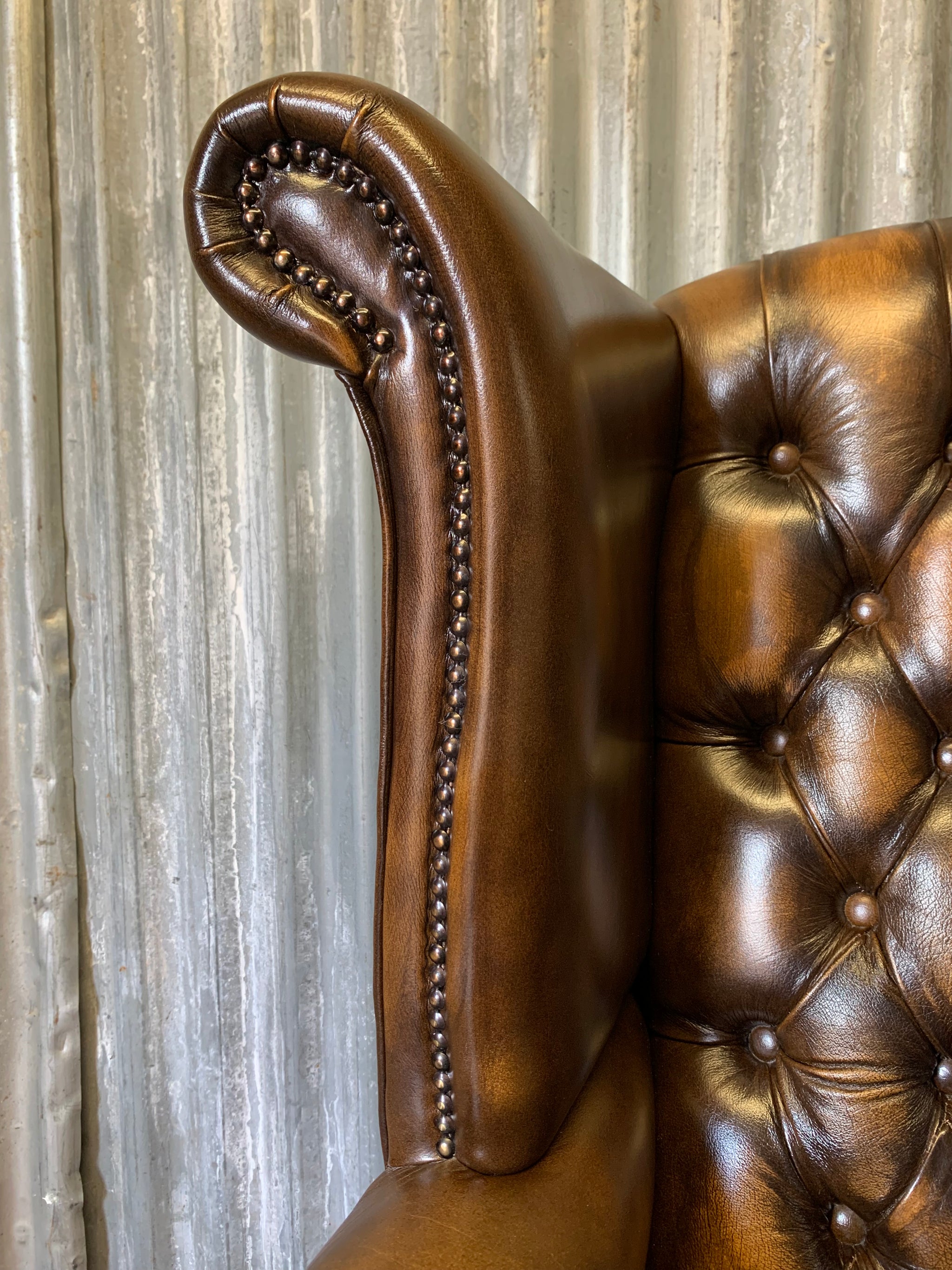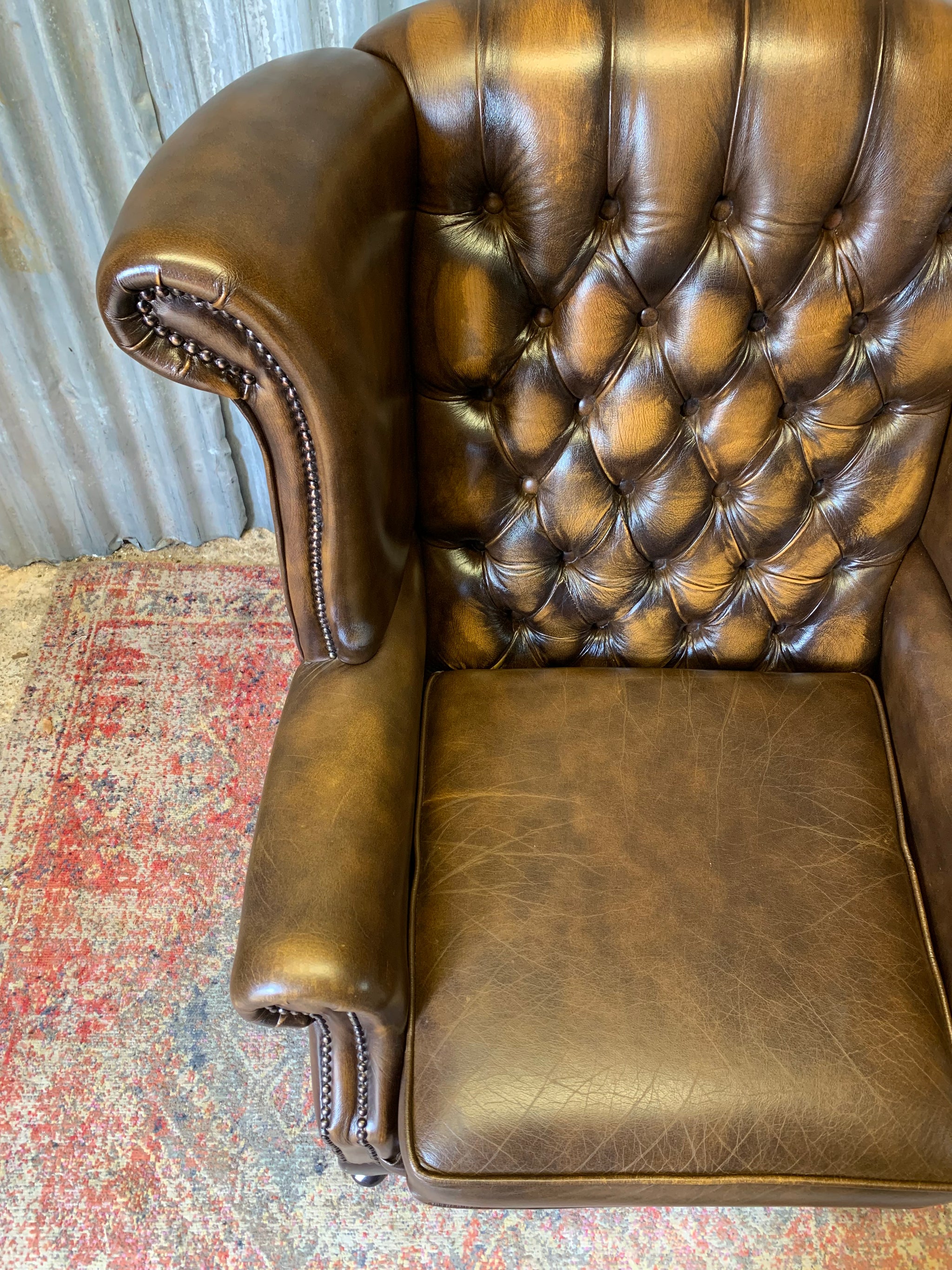 This chair is upholstered in a gorgeous warm chocolatey brown leather and is in excellent order.