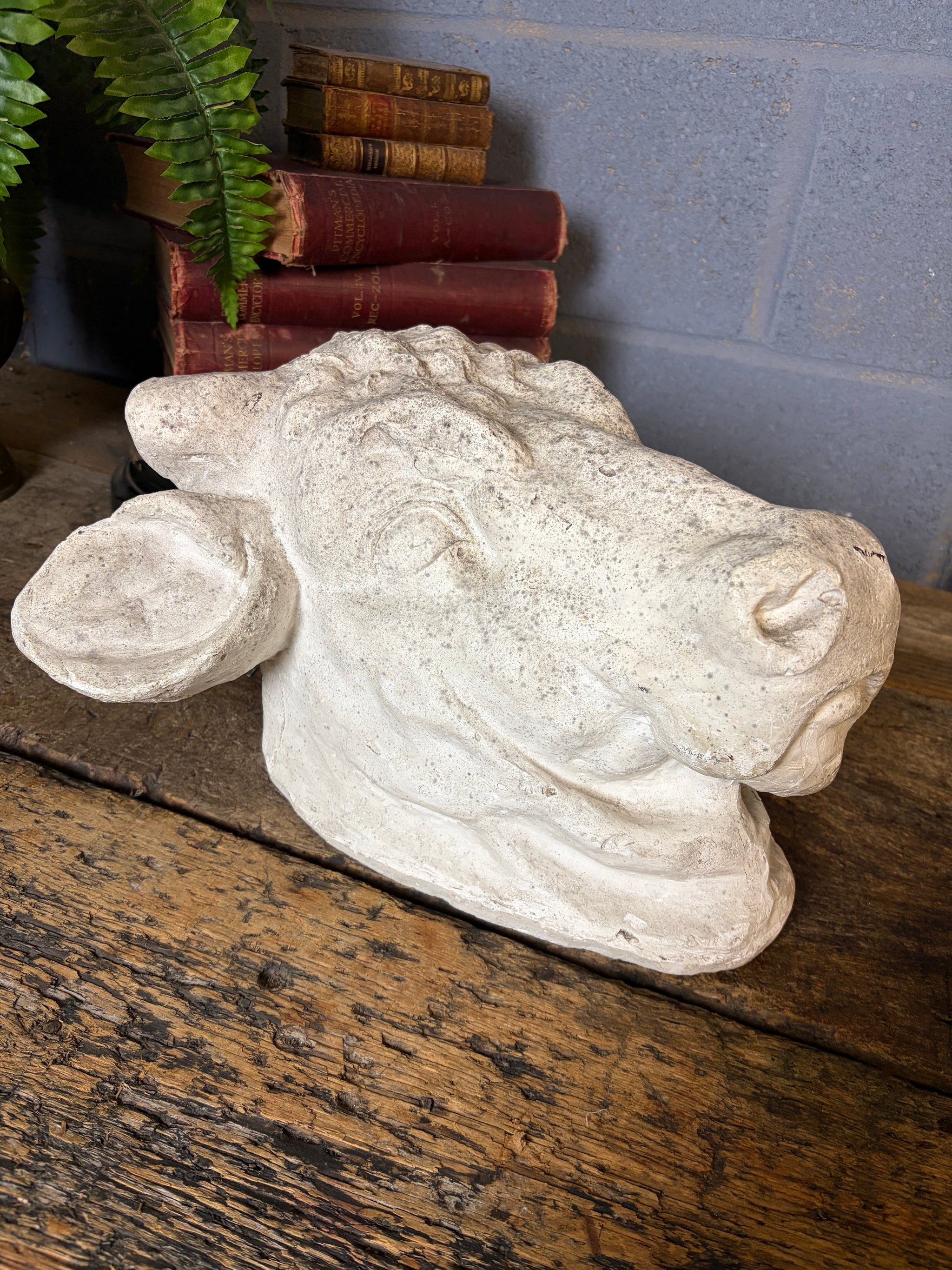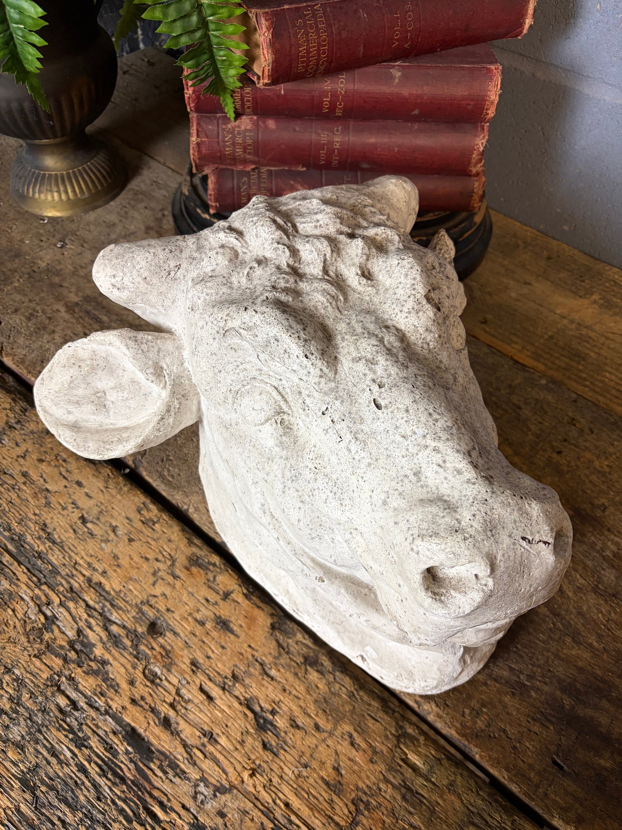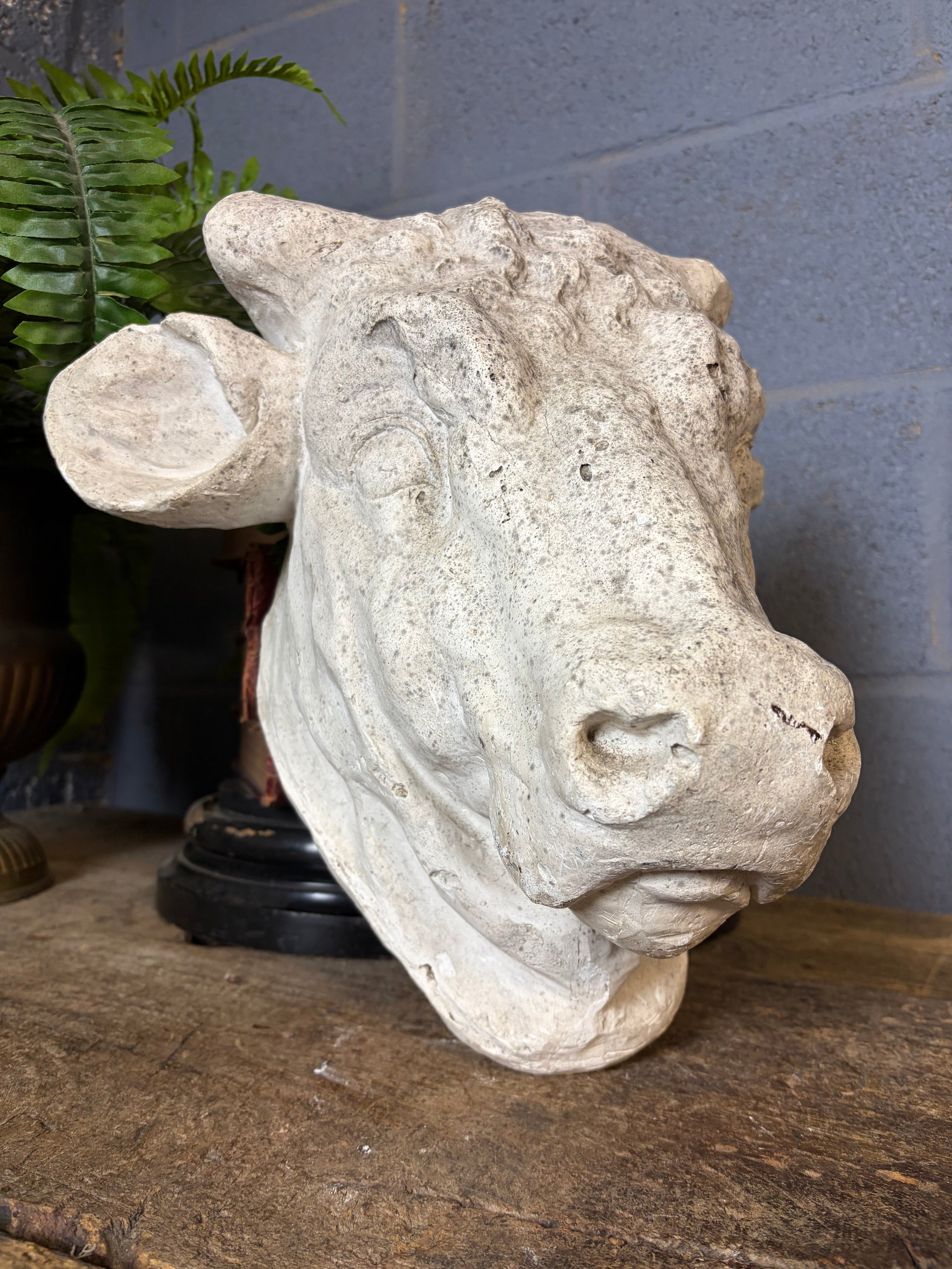 A stunning plaster model of a bull’s head.