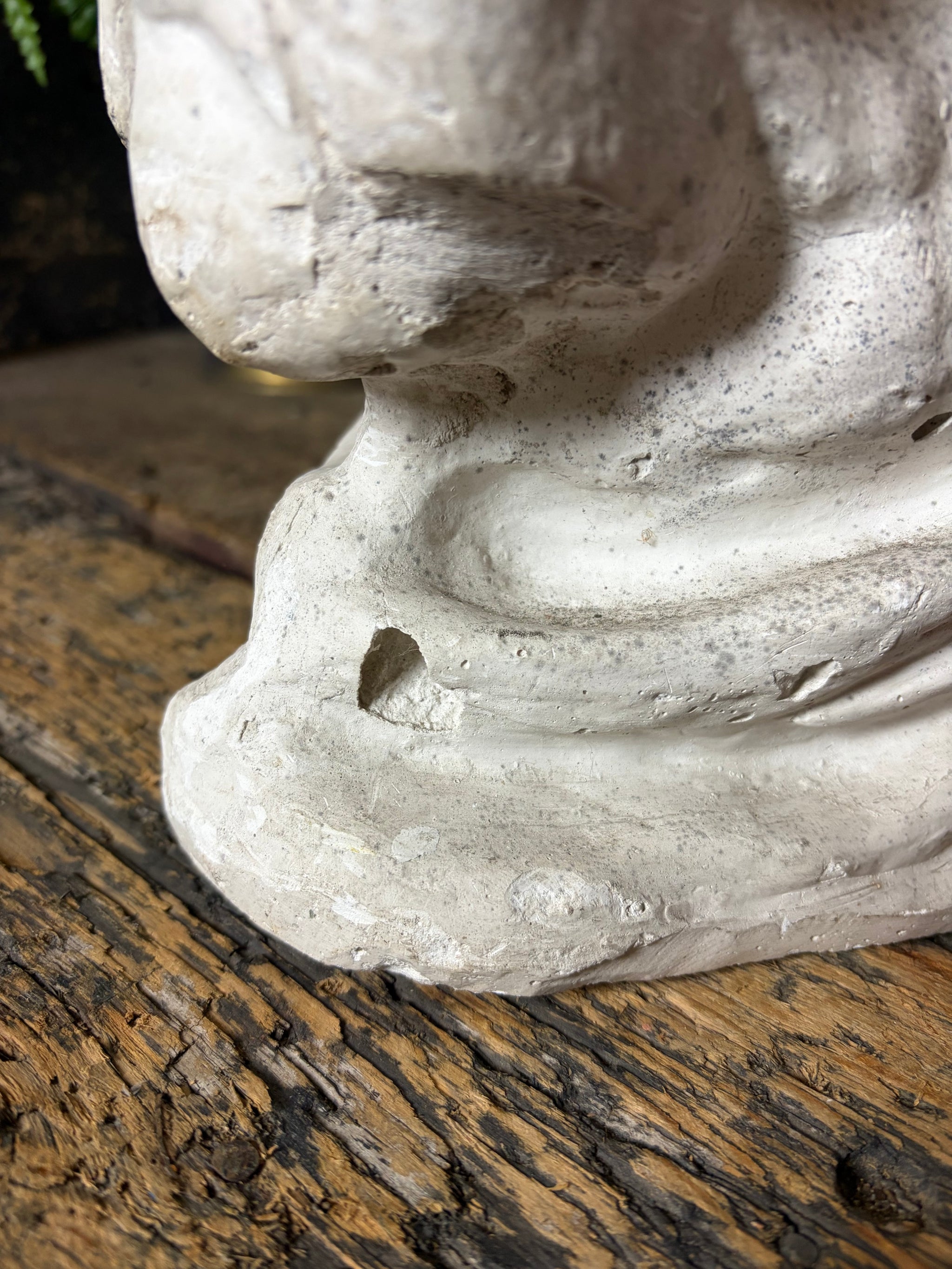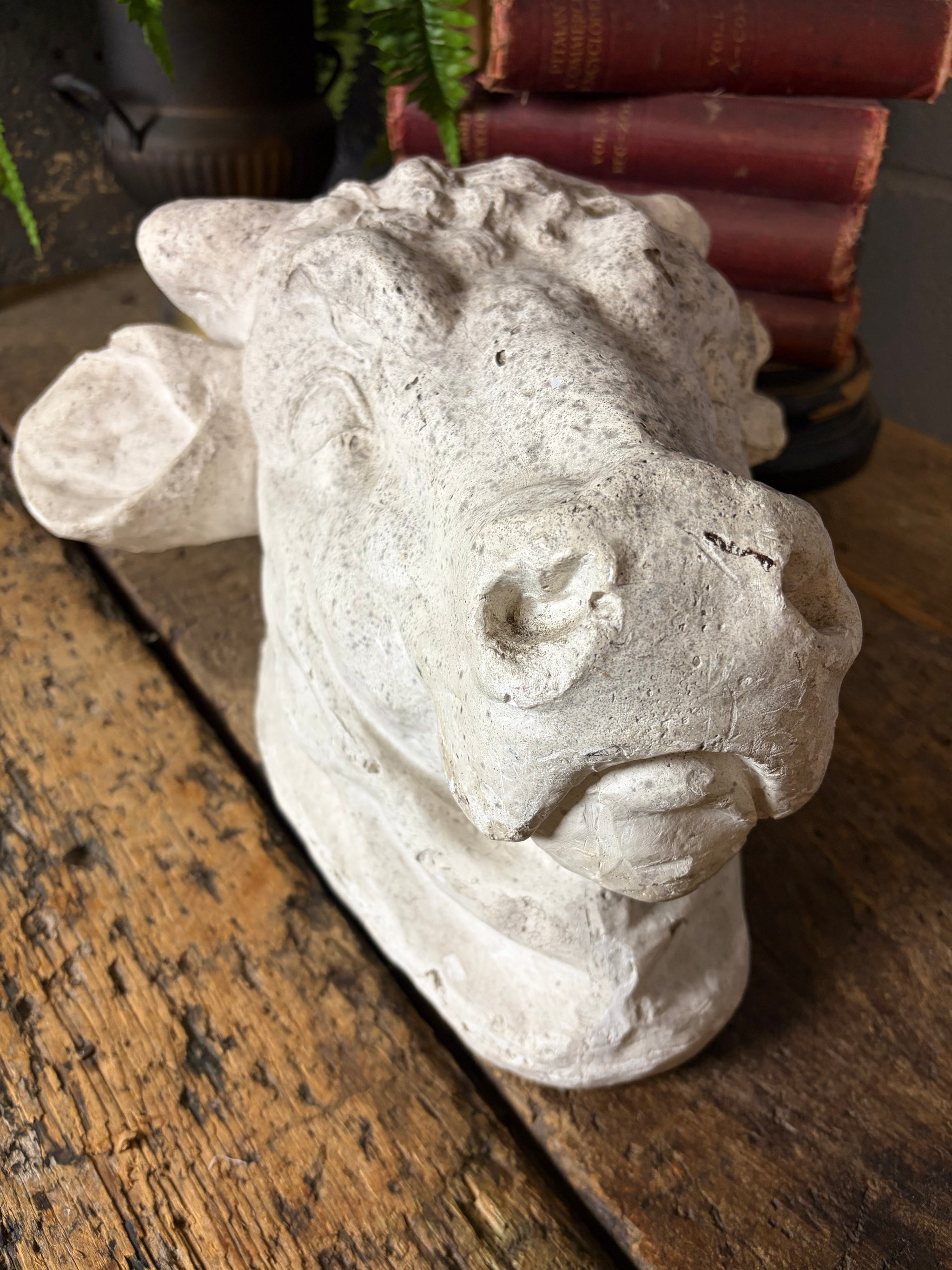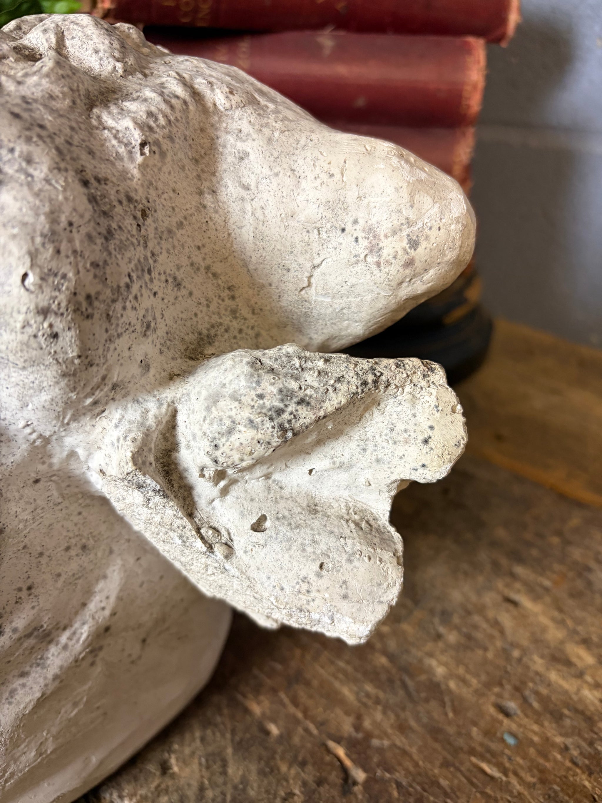 Where there are specific points to note we will detail these as far as possible but please be aware that all our items have wear commensurate with age and are as seen in the photographs. If you require any specific information please do not hesitate to get in contact. As seen in the images, but not limited to: wear to the plaster surface as shown. Old loss to one ear - edges are smooth and rounded.